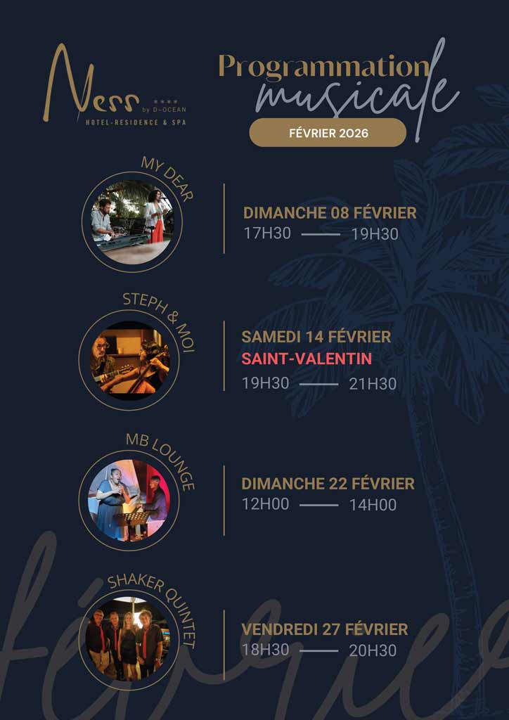 Des dimanches au bord du lagon, une Saint-Valentin en musique et des soirées jazz… Février se vit au rythme de nos artistes, entre détente et coucher de soleil !