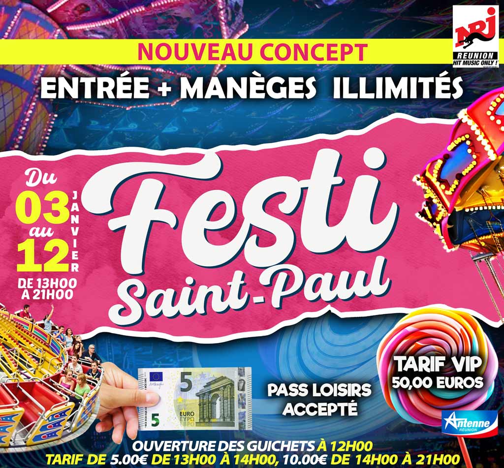 Bienvenue à Festi Saint-Paul, l’événement le plus attendu des vacances d’été à La Réunion ! Du 3 au 12 janvier 2025, le Parc Expobat se transforme en un immense parc d’attractions où petits et grands peuvent s’amuser sans compter.