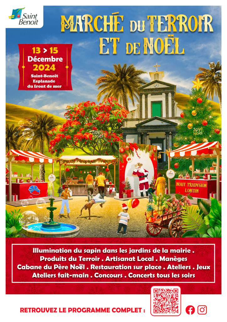 Noël approche à grands pas, et l’Esplanade du front de mer à Saint-Benoît se pare de ses plus belles lumières pour accueillir le Marché du terroir et de Noël. Du 13 au 15 décembre 2024, plongez dans une ambiance festive et chaleureuse où traditions locales et esprit de Noël se rencontrent. Animations, artisanat, gastronomie et moments magiques vous attendent pour un événement inoubliable.
