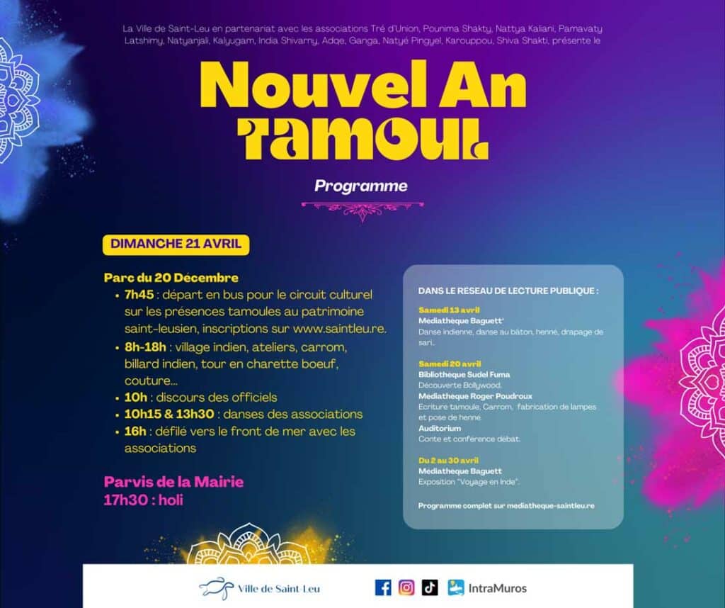 La Ville de Saint-Leu vous convie à une expérience unique lors du Nouvel An Tamoul ! Préparez-vous à une journée vibrante d'émotions, de découvertes et de festivités au parc 20 décembre, le dimanche 21 avril.