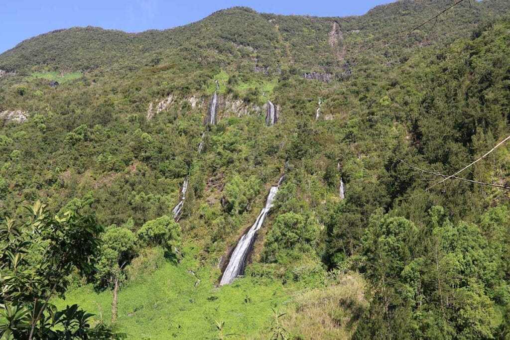 Le Voile de la Mariée est une halte incontournable sur la route de Salazie qui se trouve après le village en direction d'Hell-Bourg. Votre regard sera captivé par ce rempart à gauche qui étale une multitude de filets d'eau à flanc de montagne. Sur une hauteur de 500 m, des cours d'eau se jettent de la forêt primaire de Bélouve et s'étirent dans sa plus grande largeur lors de la saison des pluies pour finir dans la Rivière du Mât.